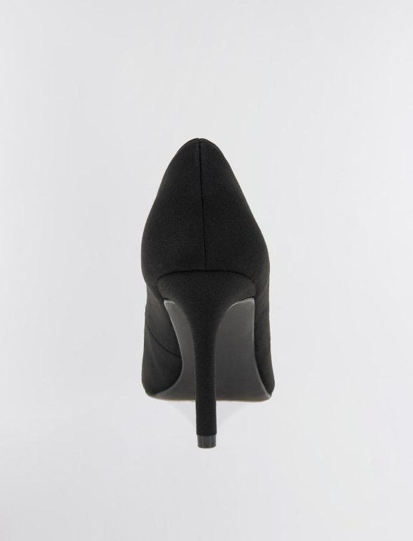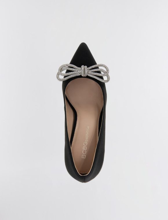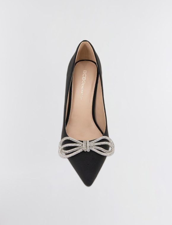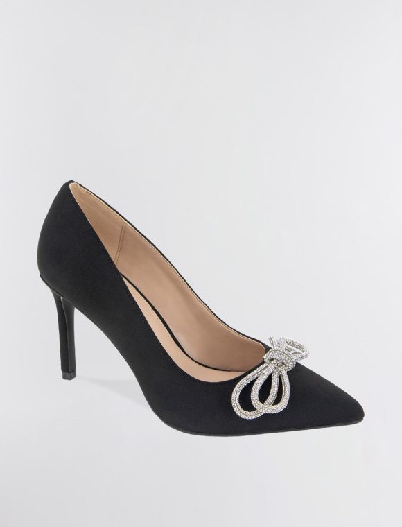 Classy black pointed toe pump made from neoprene. Topped with a sparkling rhinestone bow and finished with a stiletto heel.