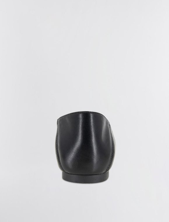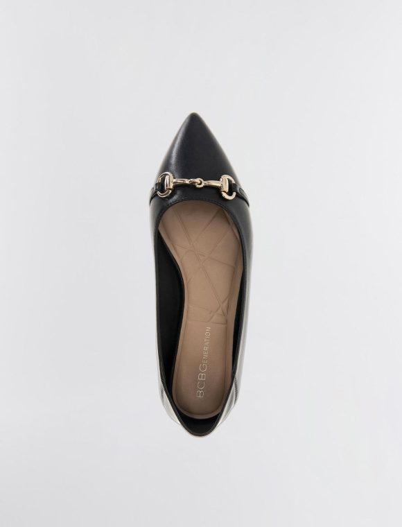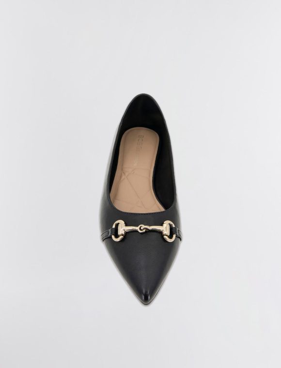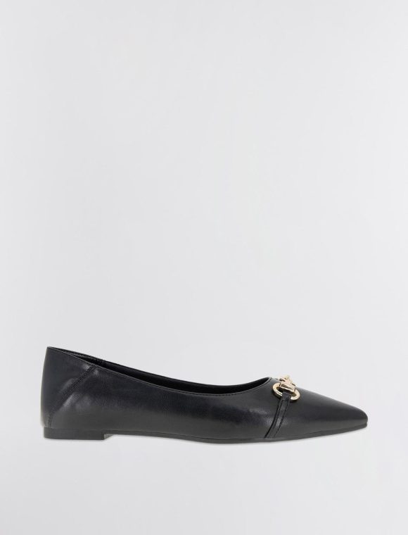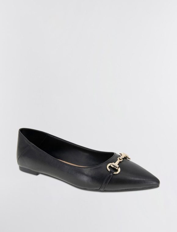 Classic black pointed toe flat made from faux leather. Designed with metal bit hardware in a seamless slip-on design that also converts into a slide.