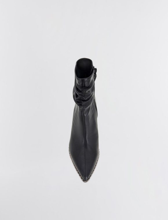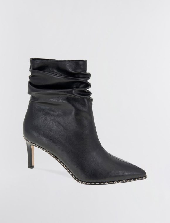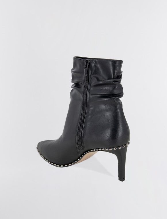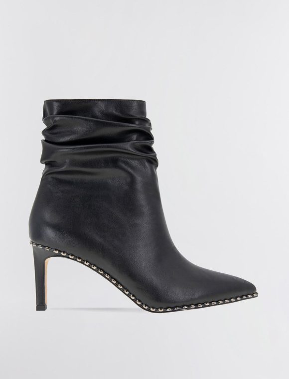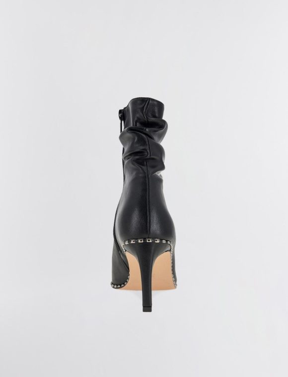 Black pointed toe bootie with an effortless mood. Done from faux leather with metal chain trim and a slouchy design. Complete with an inner zipper closure and a sleek stiletto heel.
