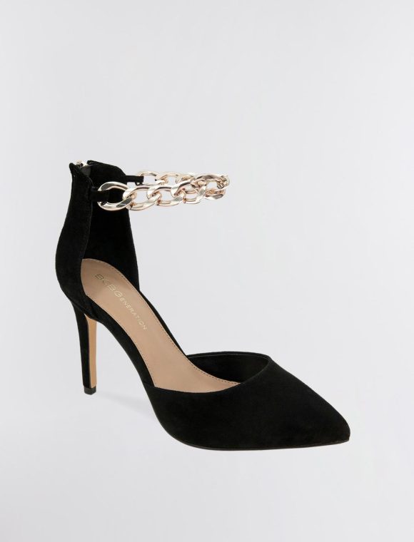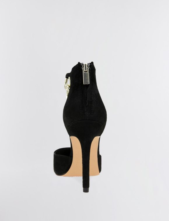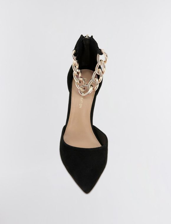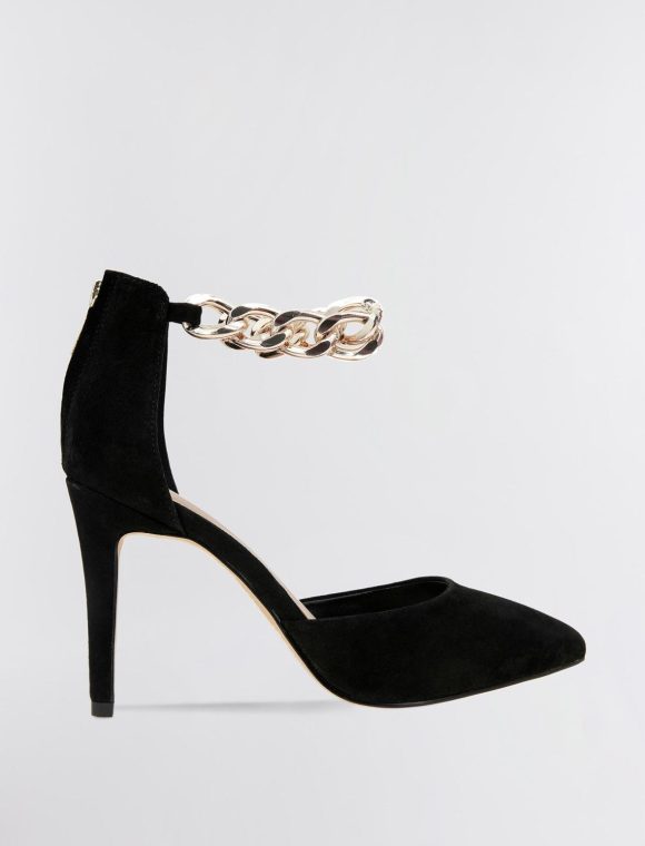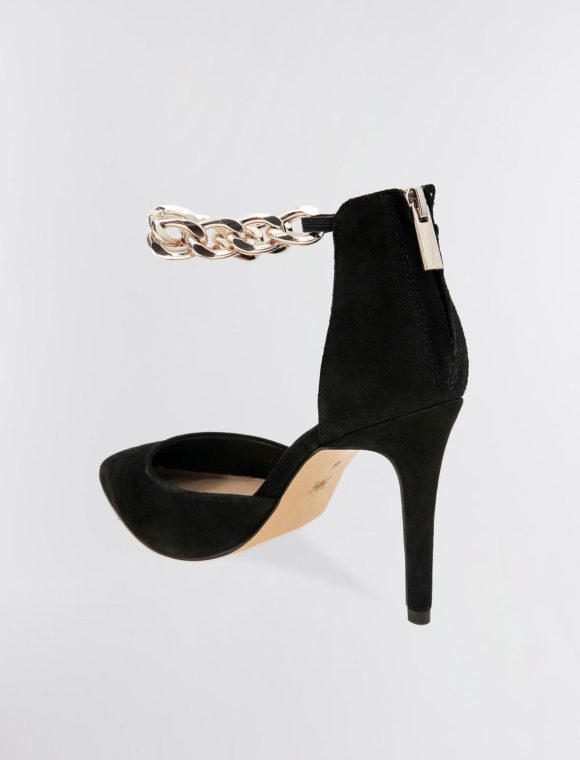 Crafted from genuine kid suede, this black pointy toe pump is made with an edgy ankle chain, an open vamp and a stiletto heel that’s complete with a back zipper closure.