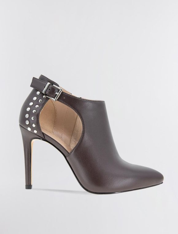 Edgy brown shootie made from faux leather and embellished with metal studs. Designed with a pointed toe and a sexy cutout. Topped with an adjustable buckle and inner zipper closure.