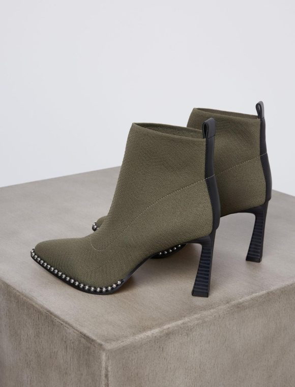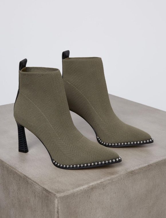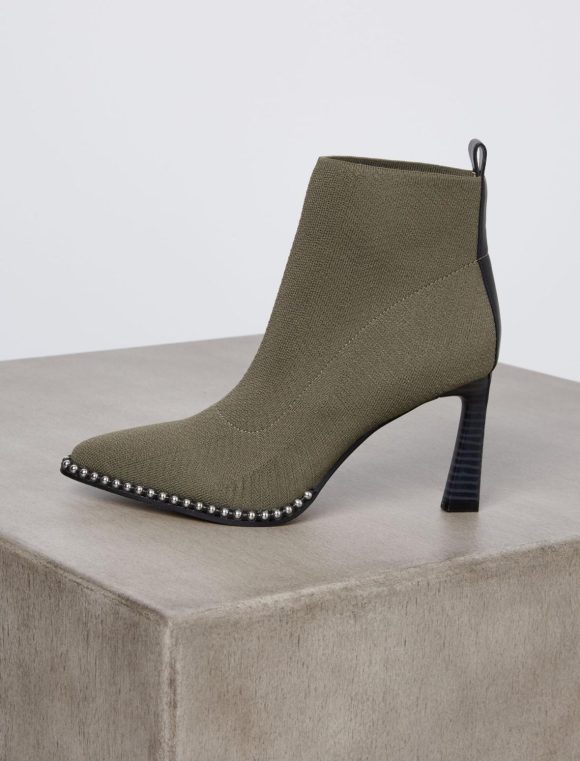 Pointed toe bootie with a hint of edge. Made with a ball chain trim. Crafted from a stretch fabric.