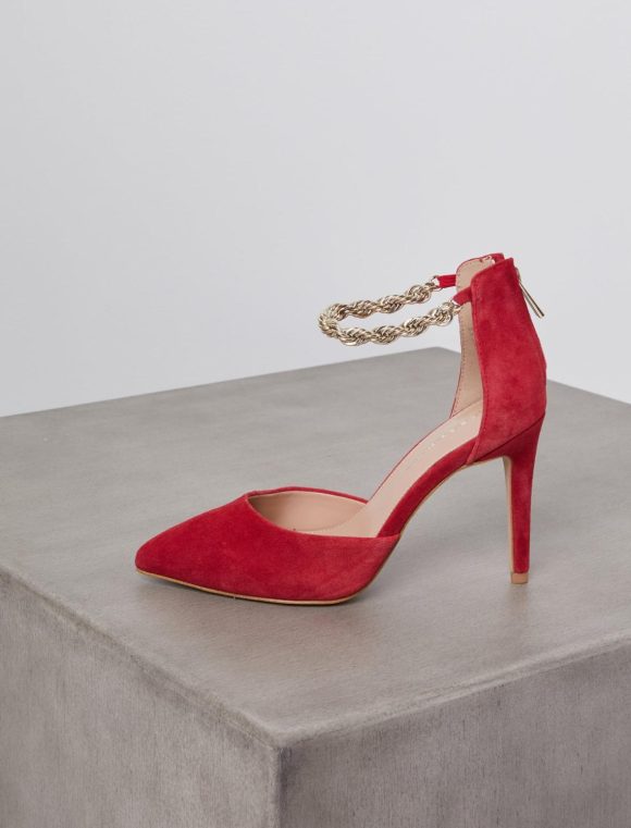 Pointy toe pump crafted from smooth suede. Topped with an ankle chain detail. Finished with a back zip and a sleek stiletto heel.