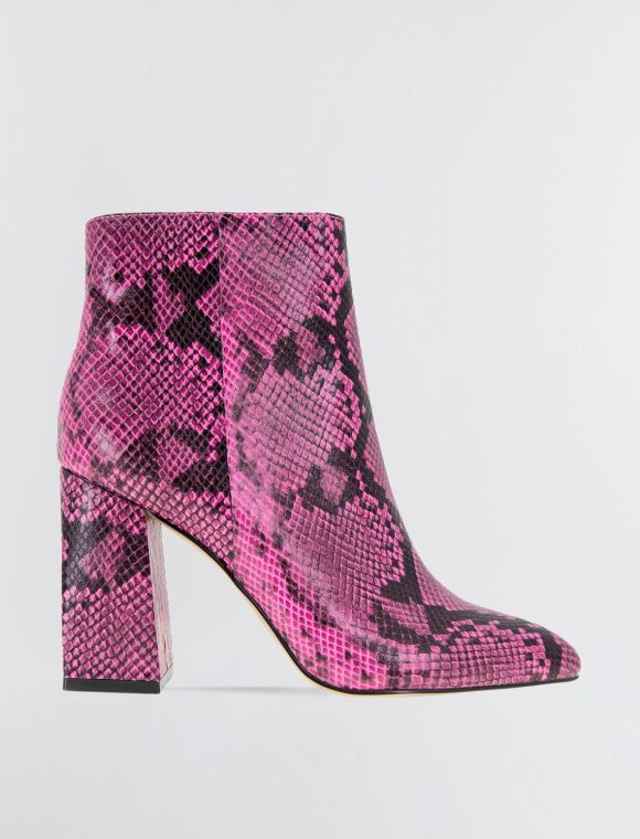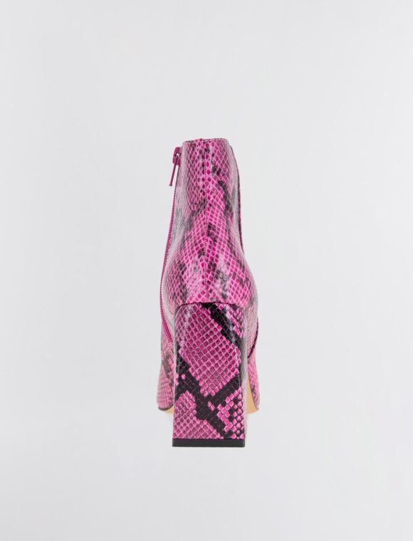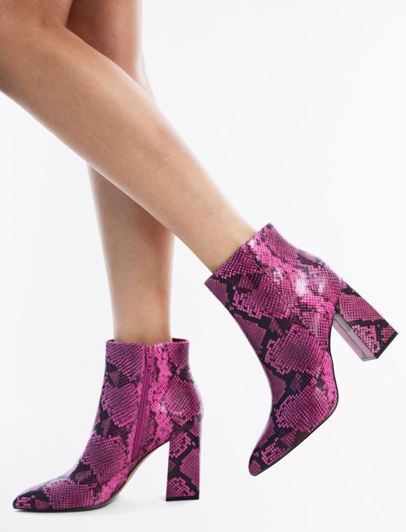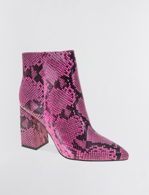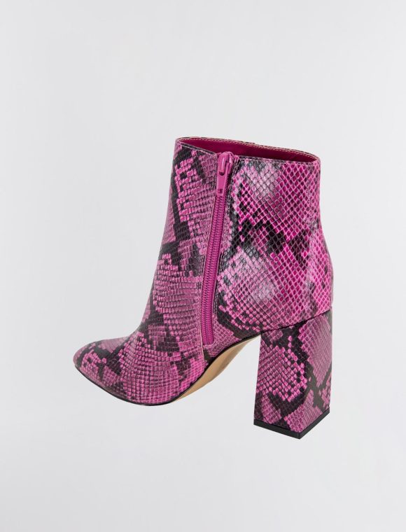 Modern pink bootie crafted from faux snakeskin leather. Done with a pointed toe and finished with an inner zipper and a chunky block heel.