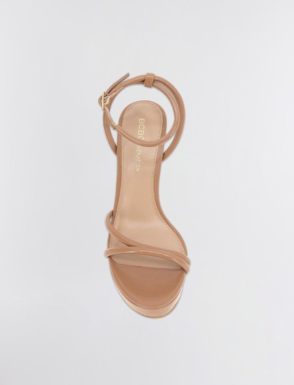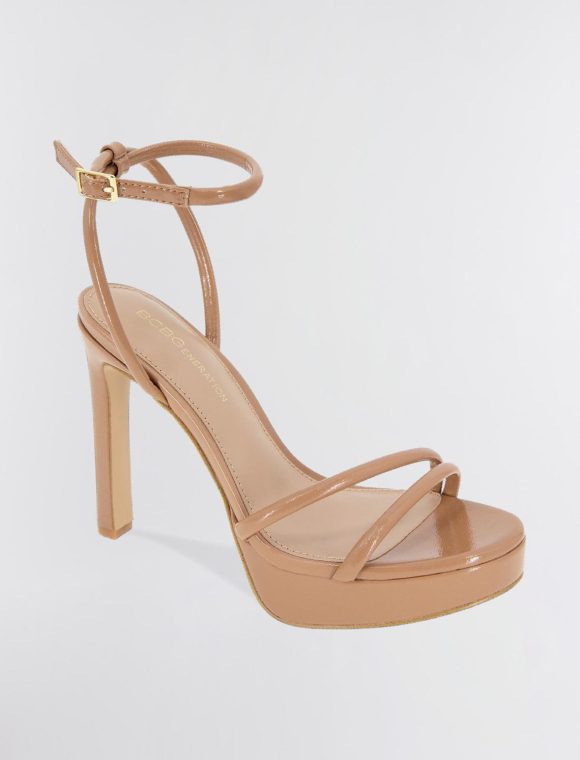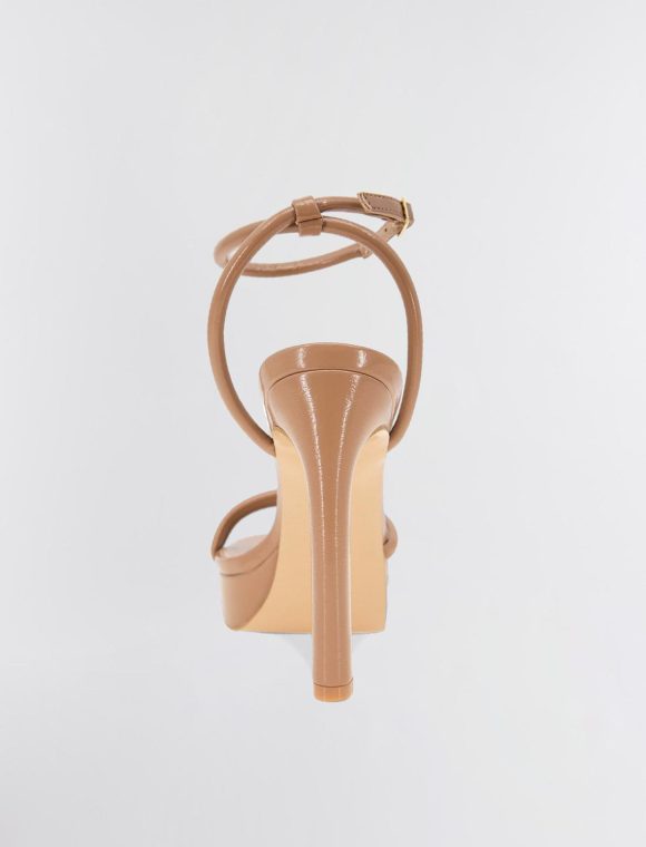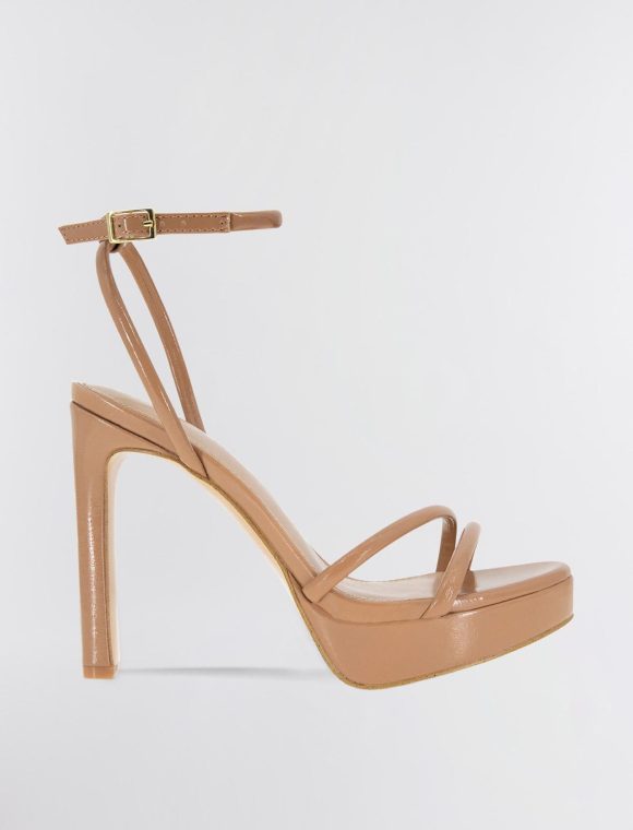 A stunning tan high heel sandal is made with a platform for added height. Crafted from patent leather for a high-shine finish. Done with dual asymmetrical toe straps and an adjustable ankle strap.
