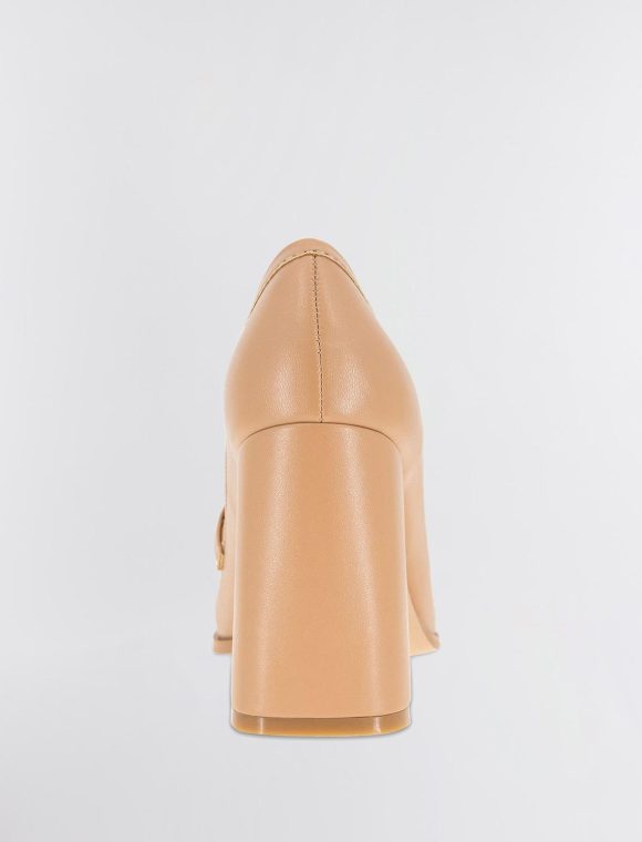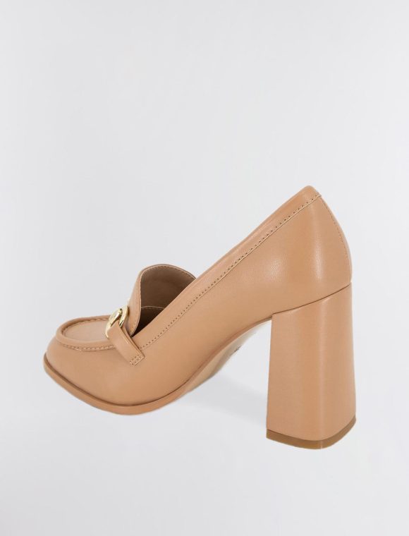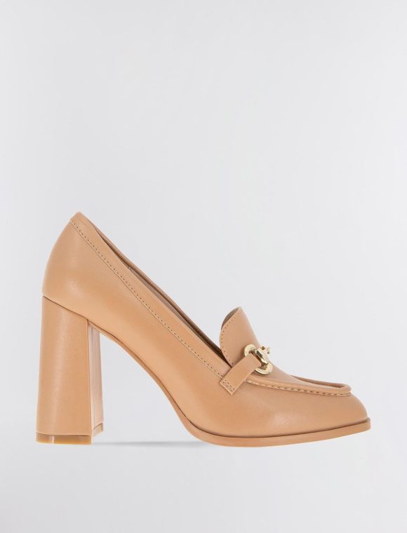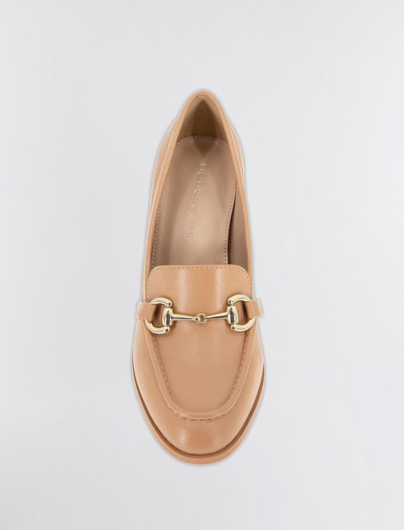 A timeless tan faux leather loafer is transformed with feminine design that features a stacked block heel and metal bit hardware.