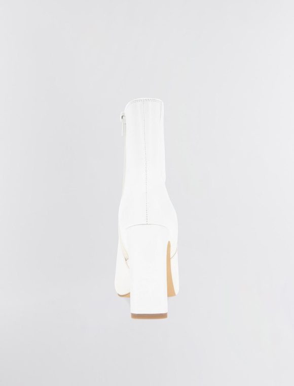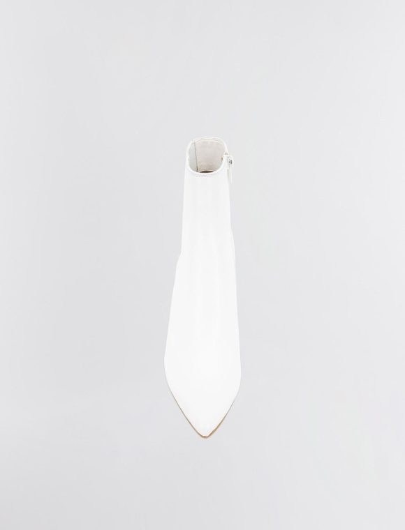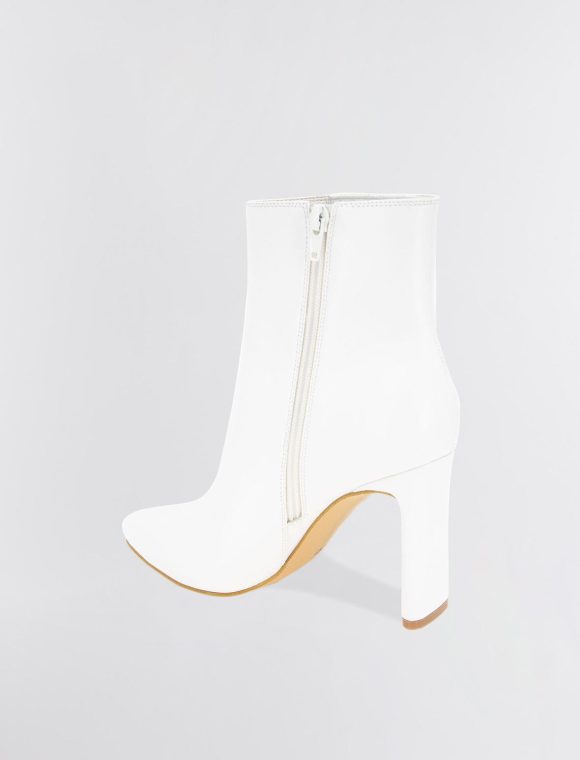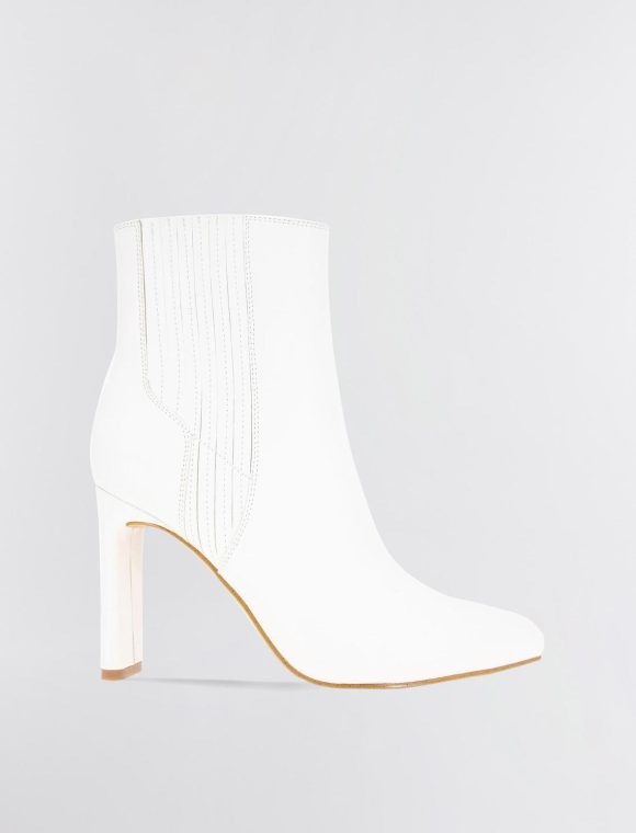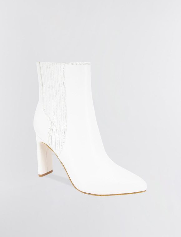 Chic pointed toe bootie in white. Designed with elasticized gore detail and a thin block heel. Finished with an inner zipper closure.