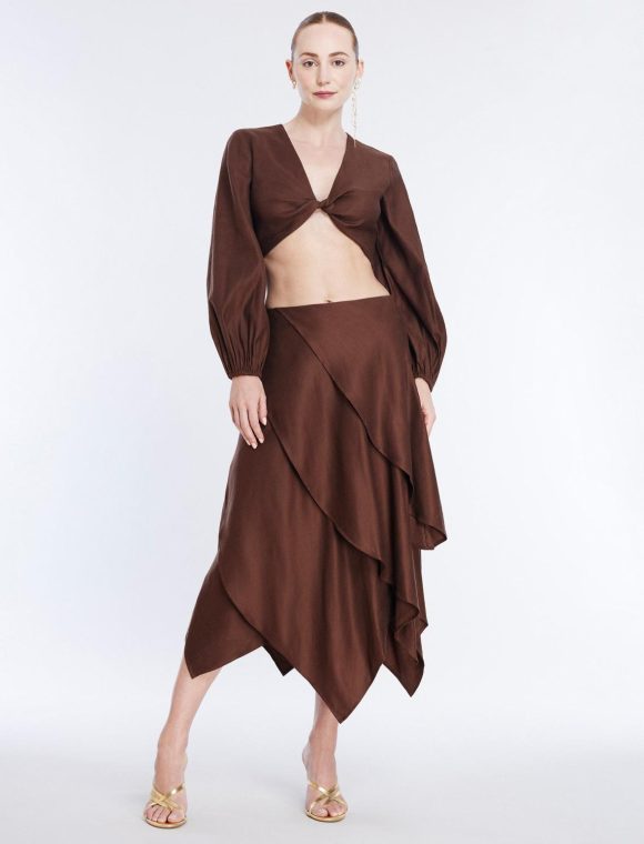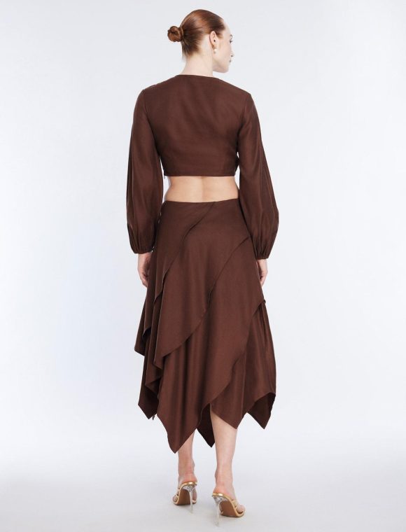 Romantic midi skirt in shade chocolate brown. Crafted from a lightweight linen blend in a soft, tiered silhouette with a fit & flare fit. Topped with a side zipper closure.