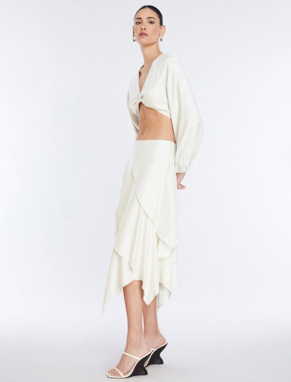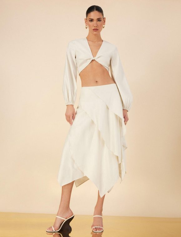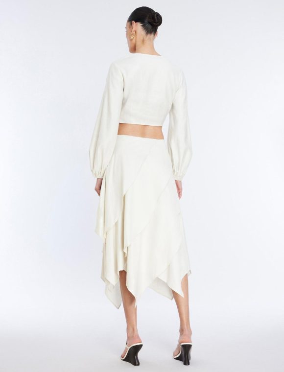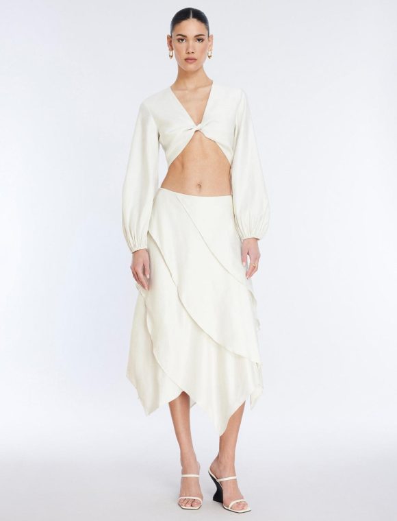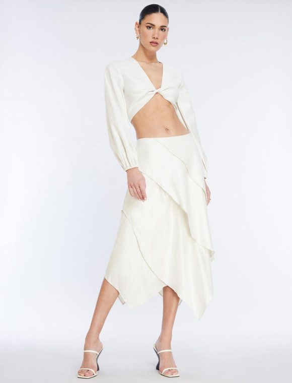 Romantic midi skirt in shade gardenia. Crafted from a lightweight linen blend in a soft, tiered silhouette with a fit & flare fit. Topped with a side zipper closure.