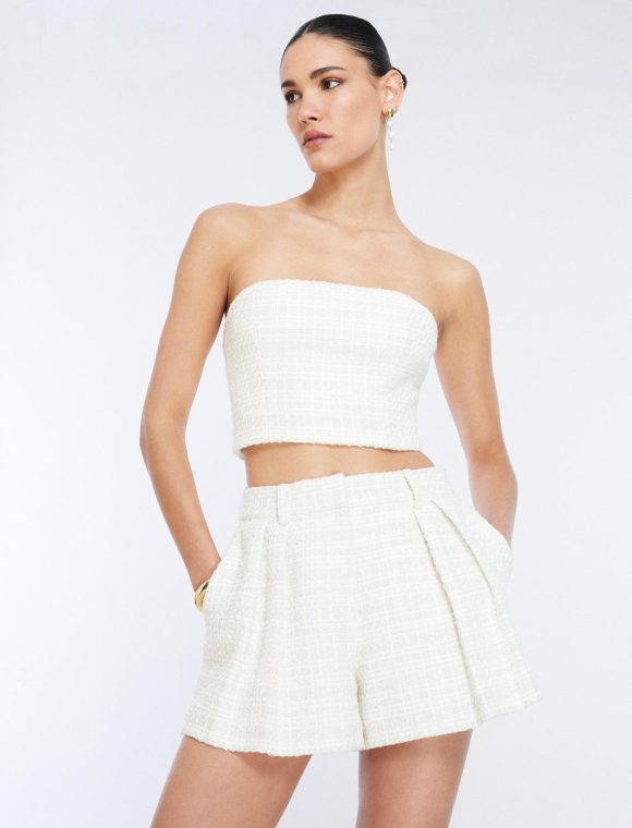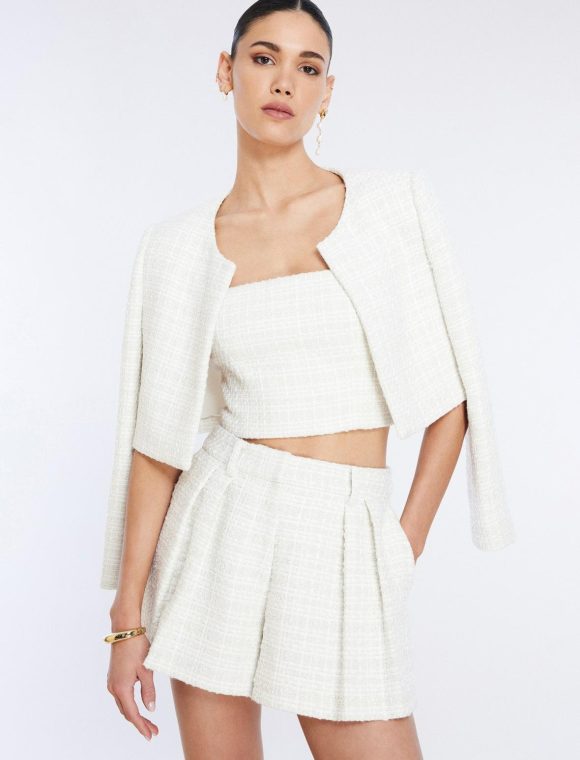Go-to tweed short that hits above the knee, topped with a pleated front. Finished with a fly zipper and hook & bar closure, belt loops, 2 side slit pockets and 2 back welt pockets.