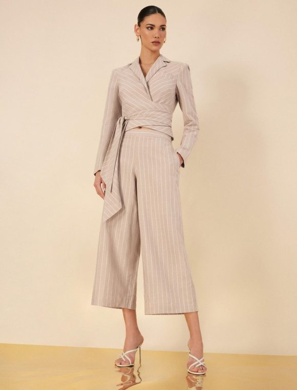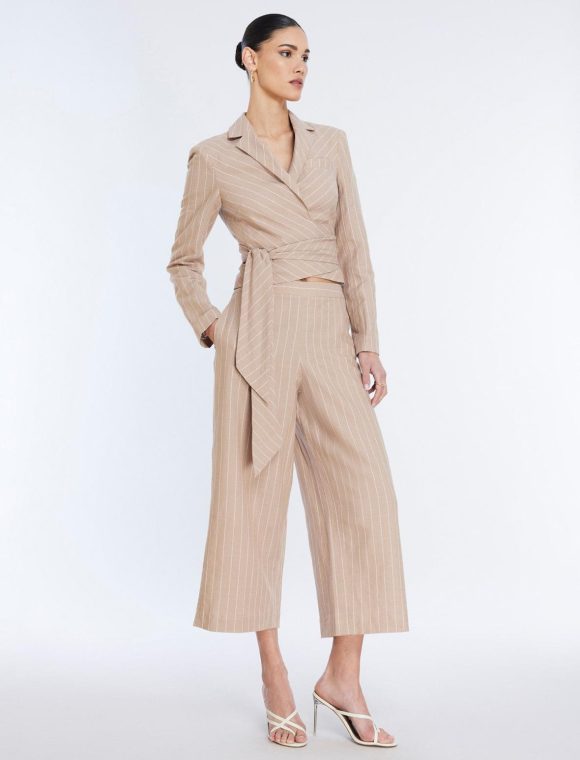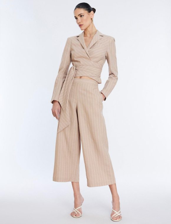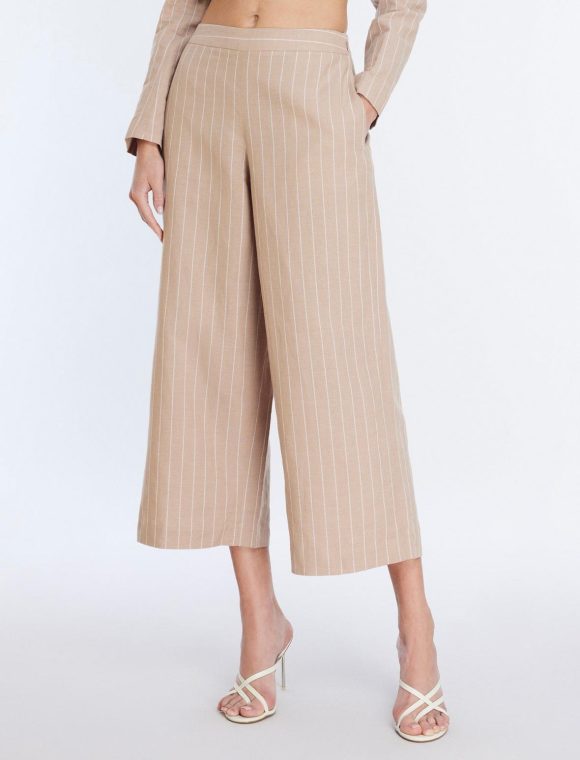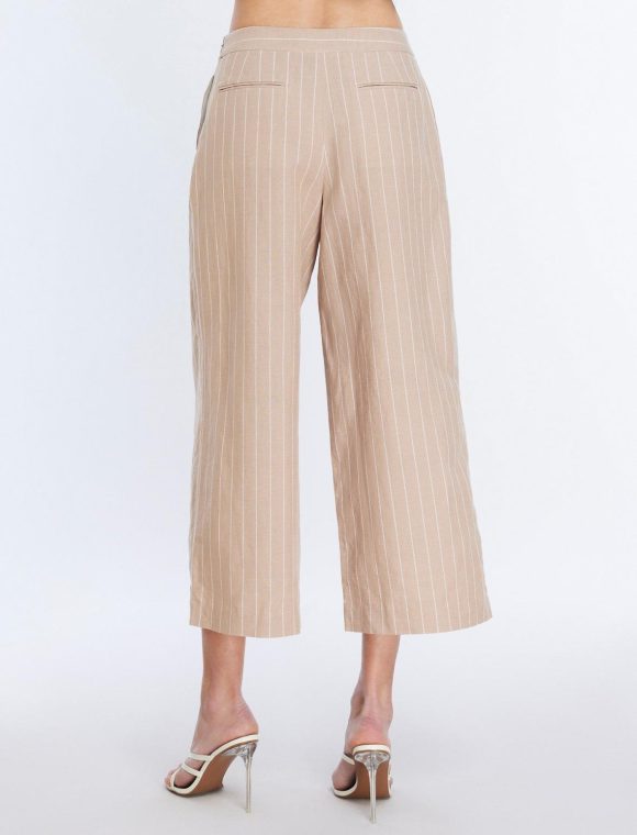 Essential khaki and white stripe pant, crafted from a lightweight linen blend in a cropped length that hits above the ankle. Done in a wide-leg silhouette that’s perfect for warm weather and topped with a side zipper closure, 2 side slit pockets and 2 back welt pockets.