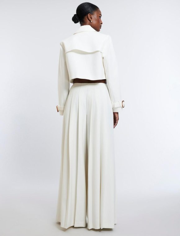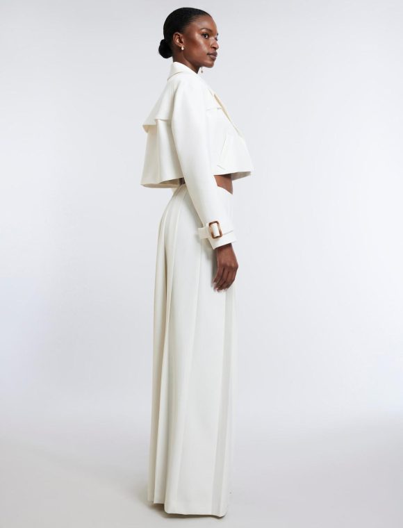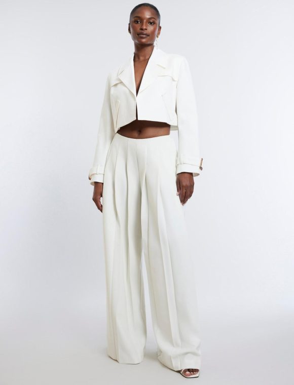 Perfect wide-leg pant in shade gardenia with exaggerated pleating for a statement look. Crafted in bi-stretch crepe with a high-waisted silhouette and an inseam that hits below the ankle. Topped with a side zipper closure and two functional side slit pockets.