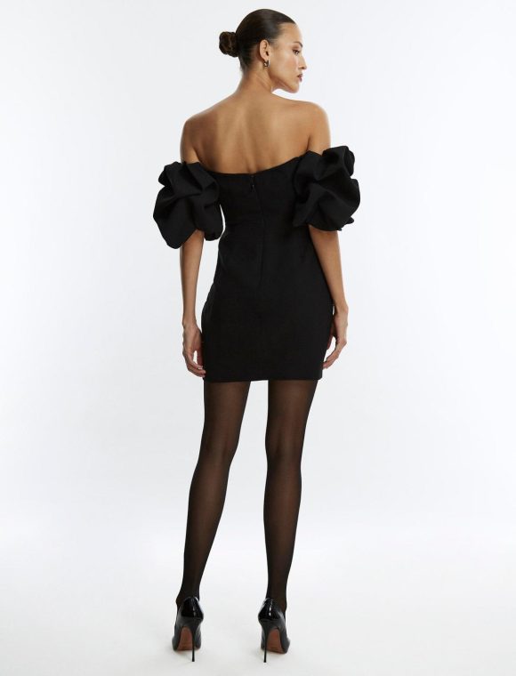 Feminine mini dress in black. Made from solid crepe with an off-the-shoulder sweetheart neckline. Embellished with dramatic ruffled puff sleeves for a feminine touch.