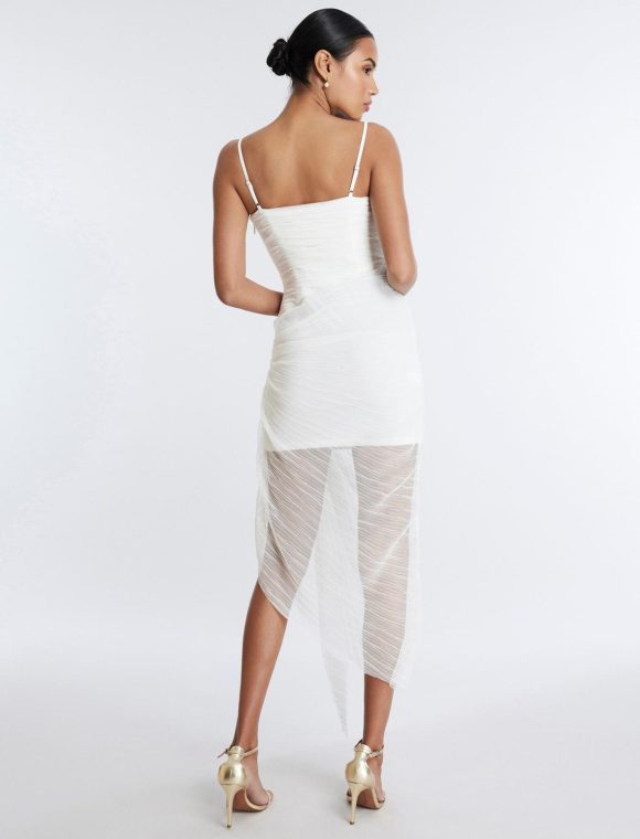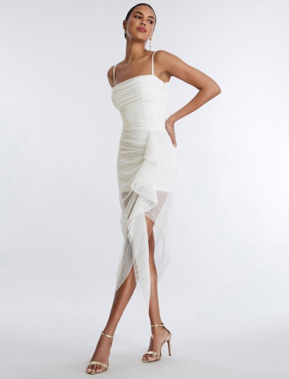 Bold ruched dress in shade gardenia. Topped with a straight neckline and adjustable straps. Crafted in a mini length with a sheer overlay that hits below the knee. Done in a bodycon style with allover crinkled mesh, a boned bodice and a cascading side ruffle. Finished with a side zipper closure.