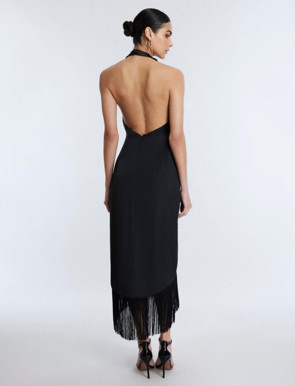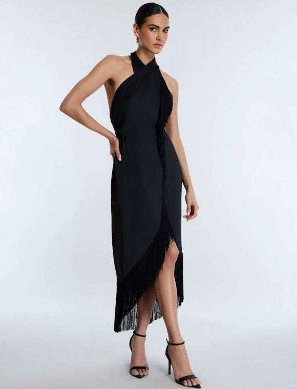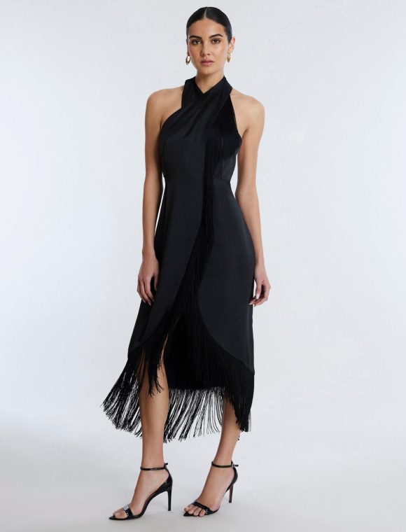 Chic black dress with a crossover halter neckline and a stunning fringe trim detail. Crafted from lightweight satin in a faux wrap silhouette that hits at the ankle. Finished with a tulip skirt, back zipper and neck button closure.