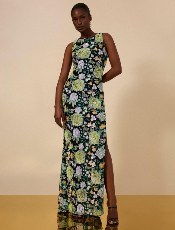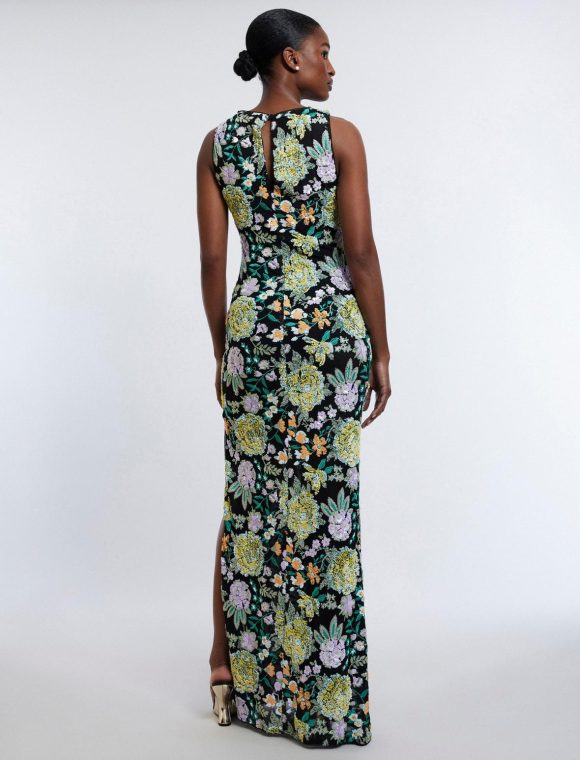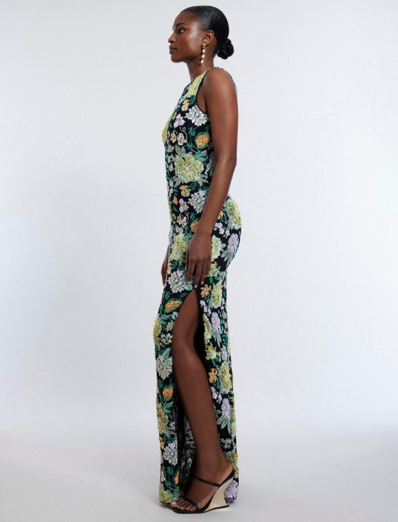 Exquisite floral gown crafted in semi-sheer stretch mesh with allover embroidery. Done in a sheath silhouette with pull-on construction and a button at the neckline. Finished with a side slit.
