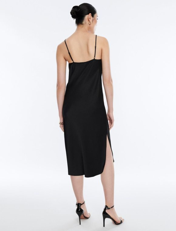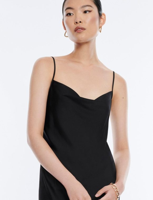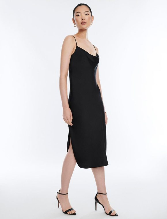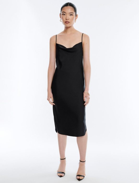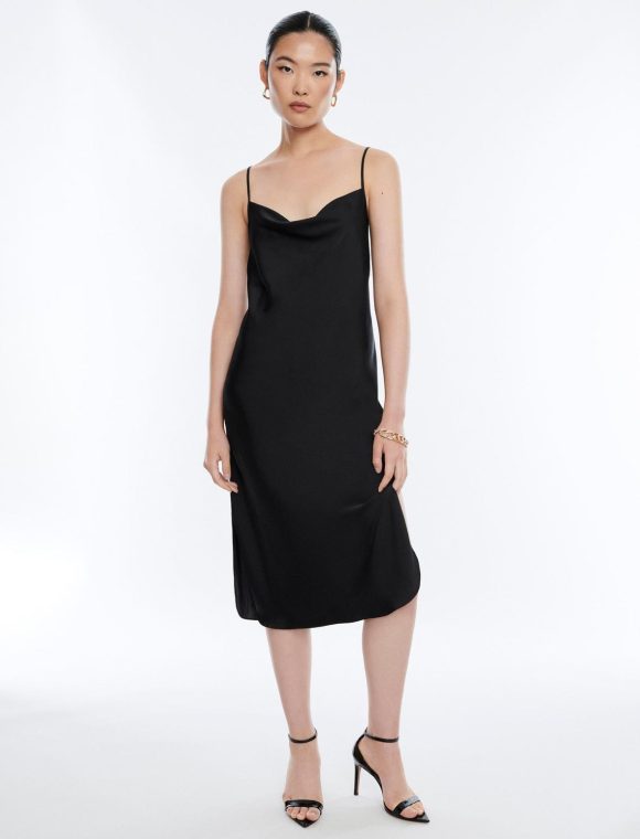 Slinky pullover slip dress for a sultry mood. Done from shiny vintage satin with a draped cowl neckline and adjustable spaghetti straps. Finished with side slits in a midi length.
