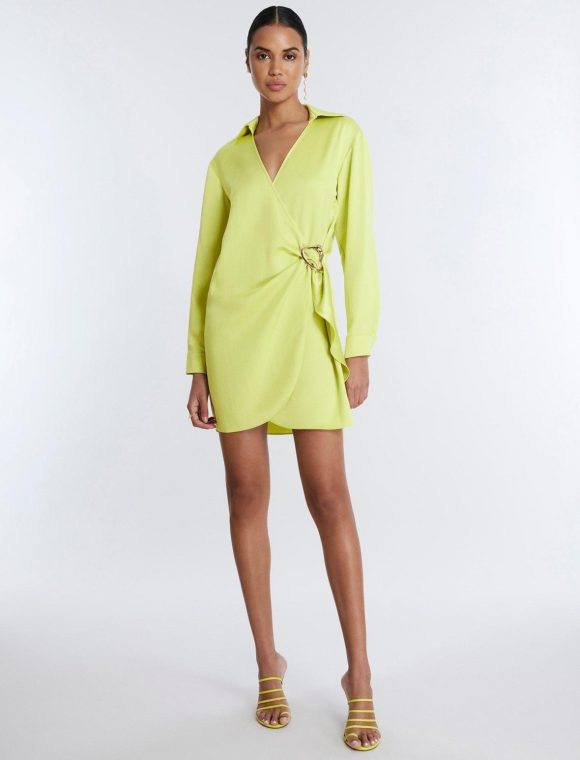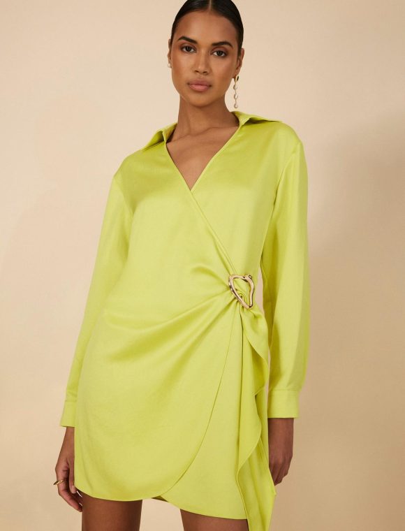 Go-to yellow mini dress in a wear-everywhere faux wrap style. Topped with long sleeves and button cuffs and a surplice neckline and collar. Crafted in satin back twill in a mini length that hits above the knee. Finished with a waist button and buckle closure and shirring at the waist.