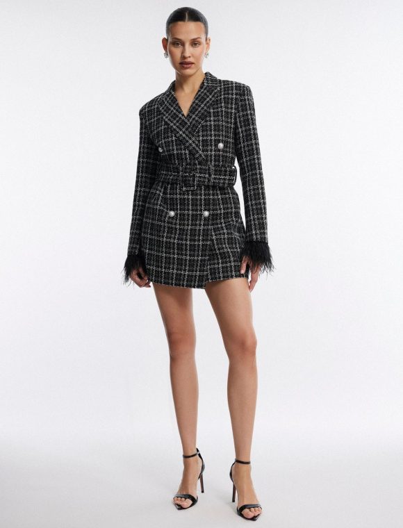 Classic black and white blazer dress made from plaid tweed. Crafted with a notch lapel, shoulder pads and double-breasted pearl buttons. Finished with pockets and playful ostrich feather cuffs.