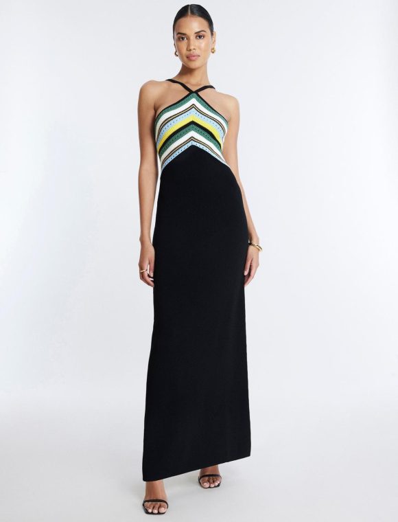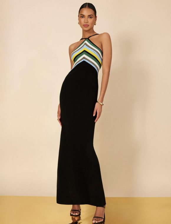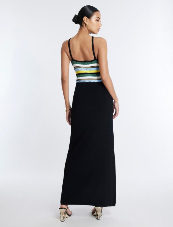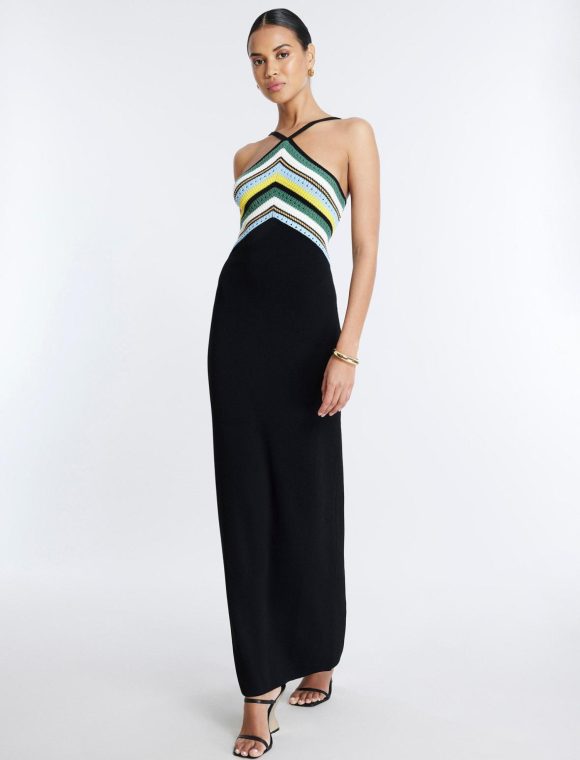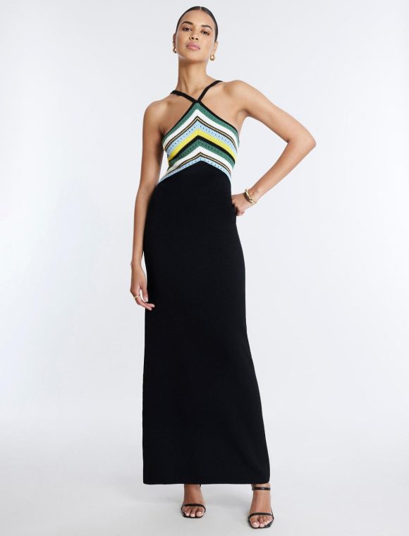 Essential dress with a classic striped top and black skirt. Topped with a halter neckline. Crafted in 100% cotton knit for a lightweight look and feel. Done in a maxi length that hits at the ankle with a pullover, bodycon silhouette. Unlined.