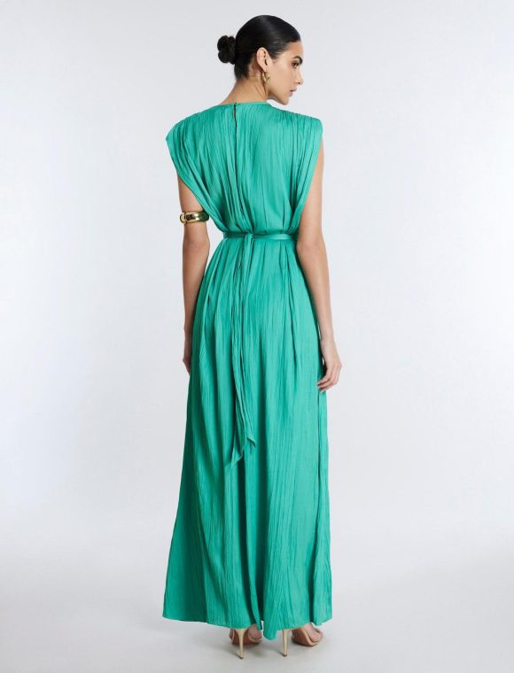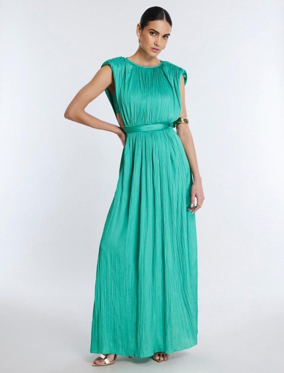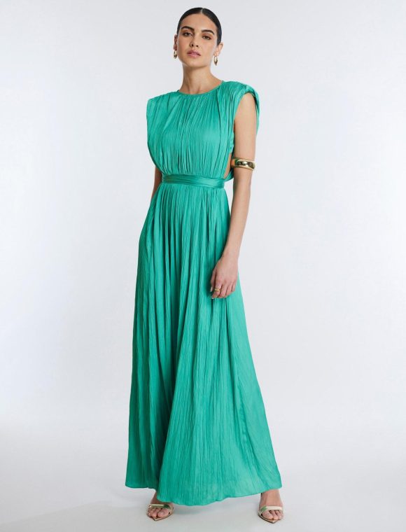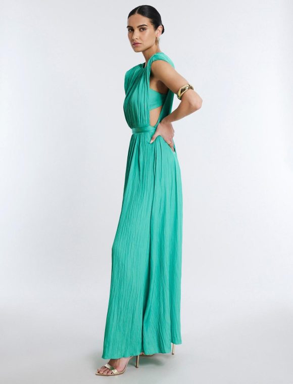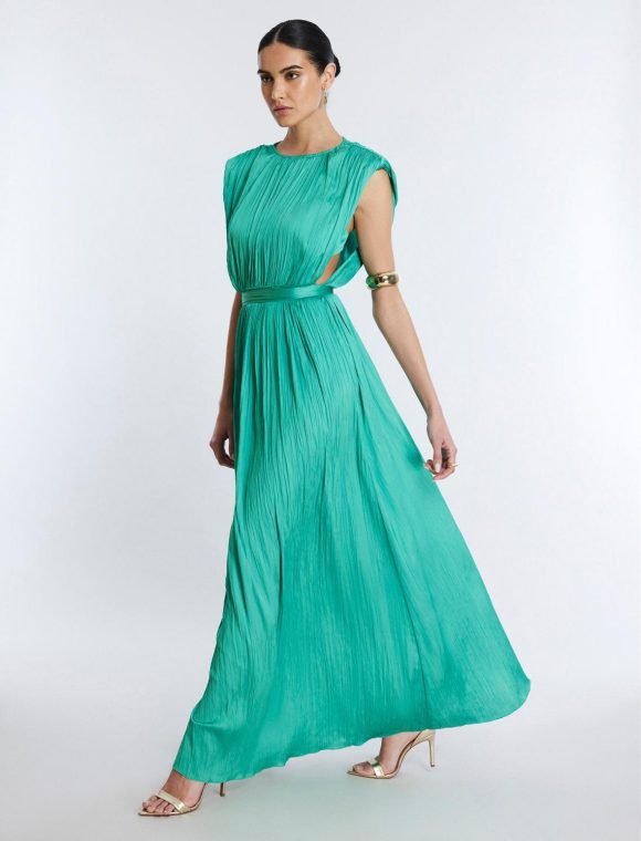Stunning maxi gown in shade winter green, topped with a jewel neckline, shoulder pads and a dramatic cape back for a head-turning look. Crafted with broomstick satin in a sleeveless silhouette that hits below the ankle. Complete with open sides at the bodice and exposed detachable bra top. Finished with a back g-hook a