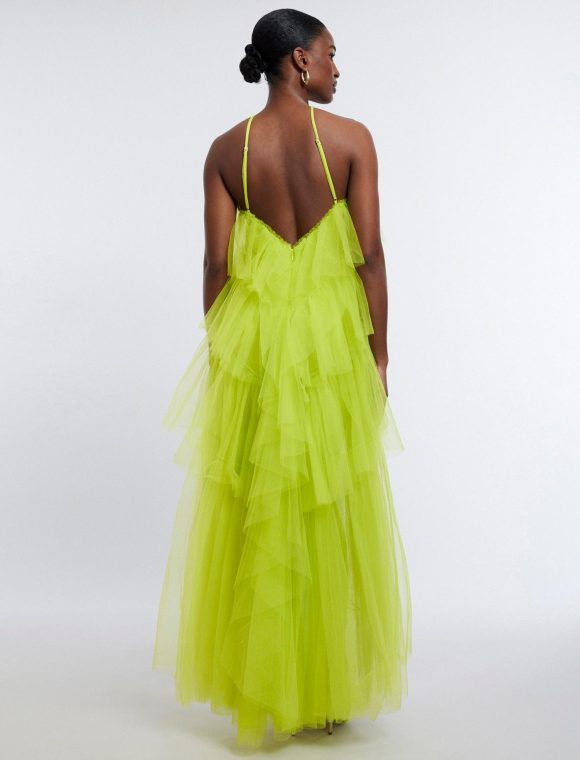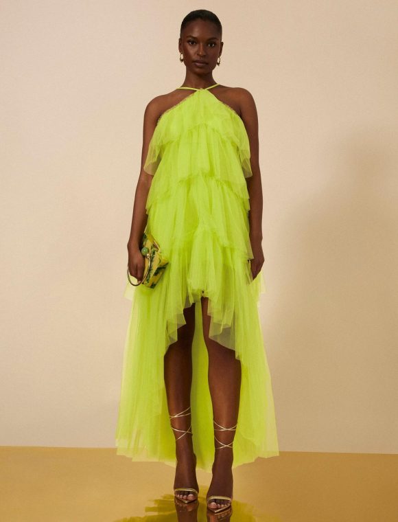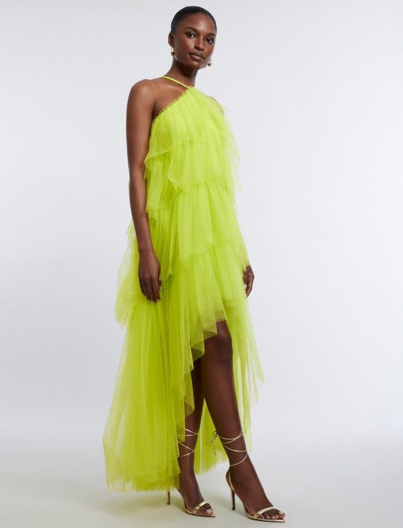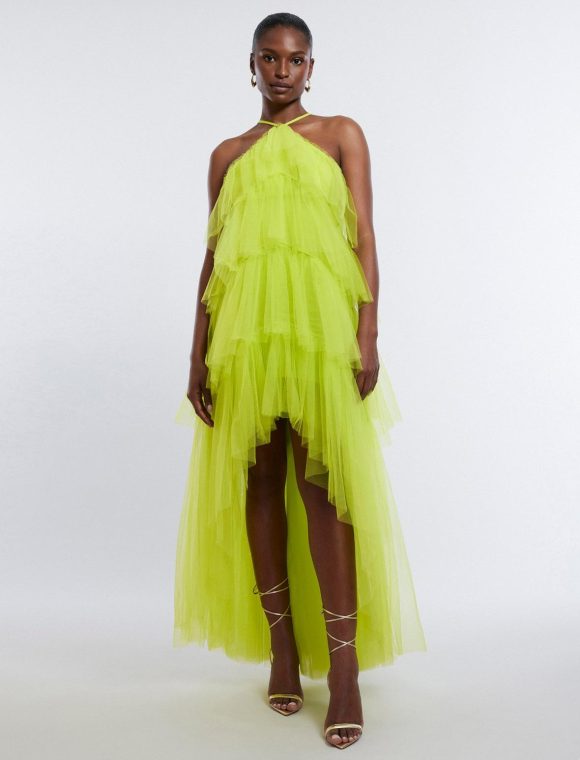 Perfect gown in shade Evening Primrose, crafted in stunning allover tulle. Topped with a halter neckline that’s sleeveless with adjustable straps. Complete with a high/low hemline that hits below ankle and cut in a trapeze style silhouette. Finished with an open back and back zipper closure.