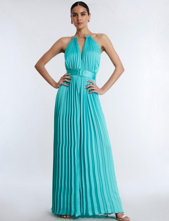 Stunning sleeveless jumpsuit in shade polynya topped with a halter neckline and eye-catching necklace trim. Crafted with an elastic waist and a wide-leg silhouette that hits below ankle in a lightweight pleated satin. Finished with a center front zipper and detachable belt.