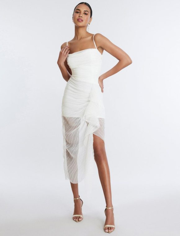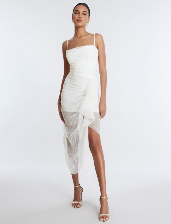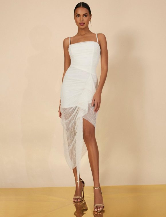 Bold ruched dress in shade gardenia. Topped with a straight neckline and adjustable straps. Crafted in a mini length with a sheer overlay that hits below the knee. Done in a bodycon style with allover crinkled mesh, a boned bodice and a cascading side ruffle. Finished with a side zipper closure.