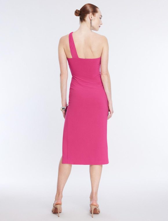 Bold midi dress in shade bright rose, topped with an asymmetrical neckline and sleeveless silhouette in a pullover sheath style that hits below the knee. Crafted from bodycon crepe jersey knit with shirring at the bust. Finished with a side slit.