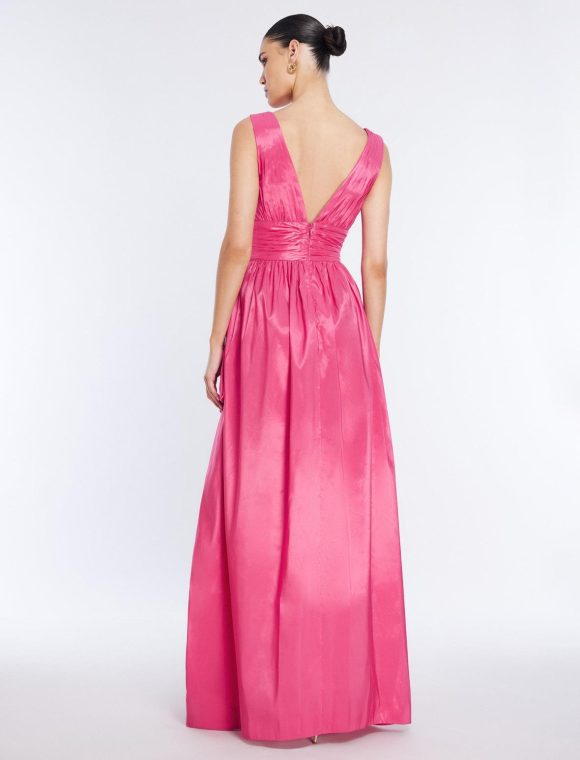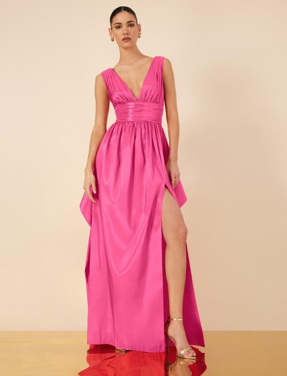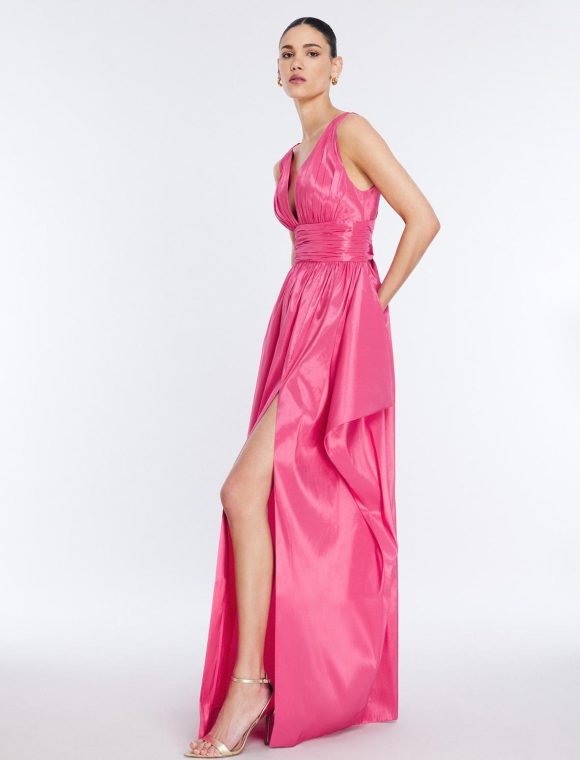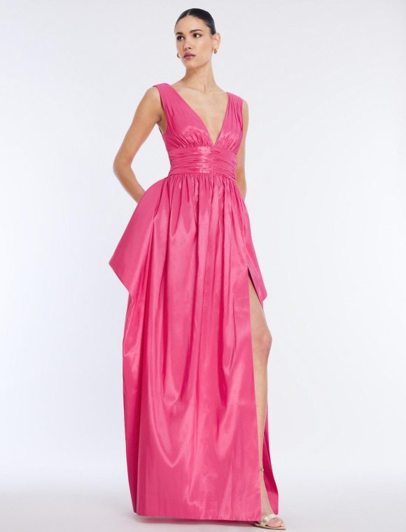 Dramatic gown with eye-catching side folds on the skirt for a bold silhouette. Crafted from Mikado-inspired fabric with pleated detailing. Topped with a v-neckline and sleeveless style. Done in a maxi length that hits below the ankle. Finished with a back zipper closure and 2 front pockets.
