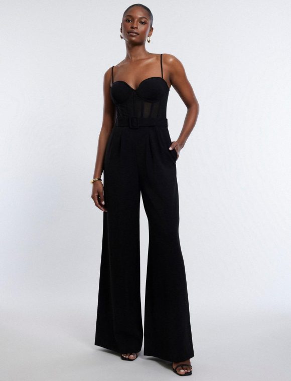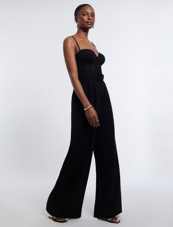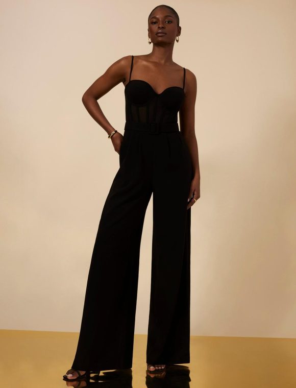Sultry black bustier jumpsuit done from essential double weave suiting. Crafted with a sweetheart neckline and adjustable straps on a semi sheer boned bodice. Its wide-leg pant has a detachable belt, side slit pockets and back welt pockets. Finished with a back zipper.