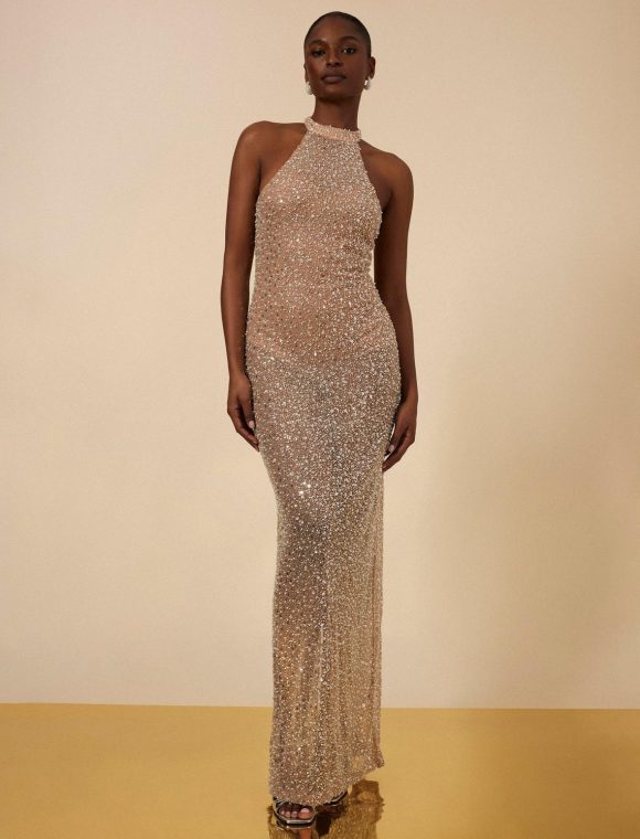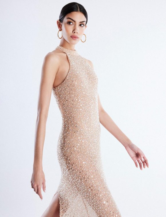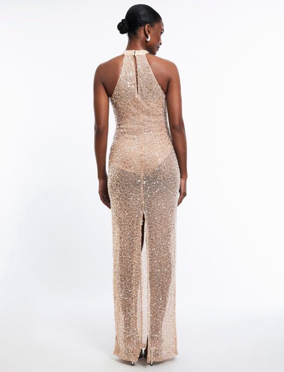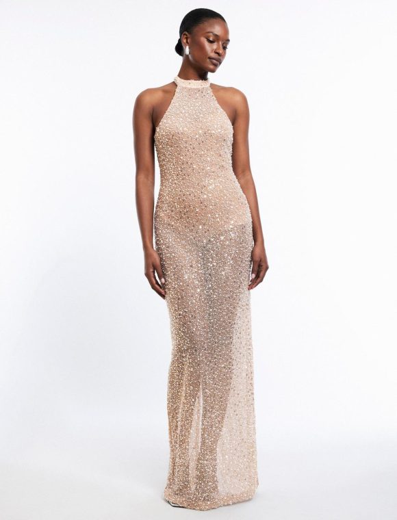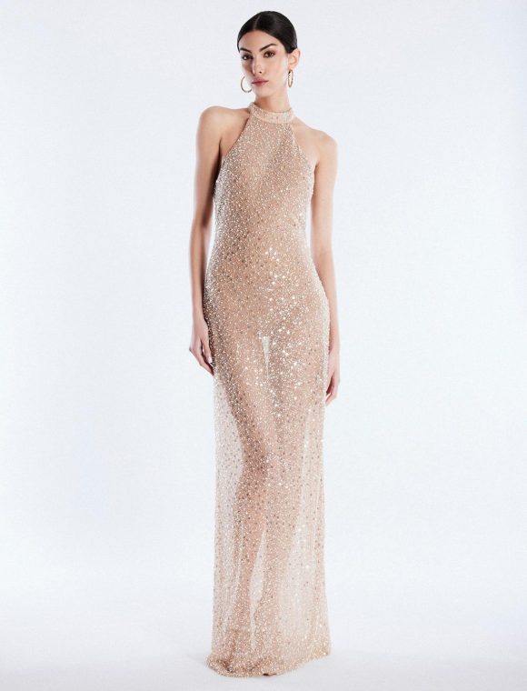 Women Evening Dresses & Gowns | BCBG Jules Beaded Semi-Sheer Halter Gown Cafe Au Lait