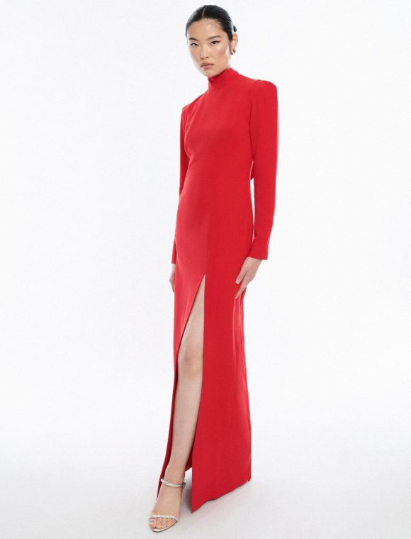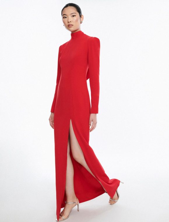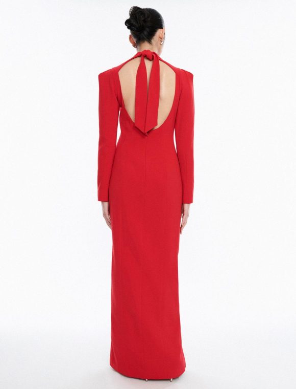 Elegant red gown with Italian design. Crafted with a mock neck that ties at the back and puff sleeves. Fitted throughout the frame with a stunning open back and front slit.