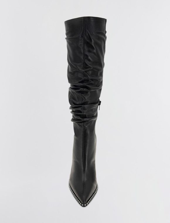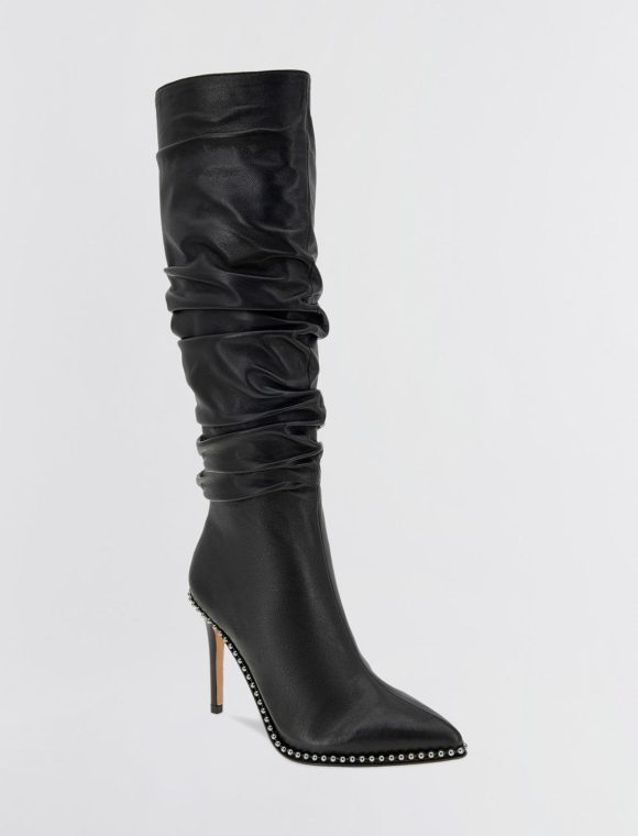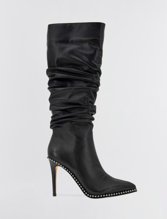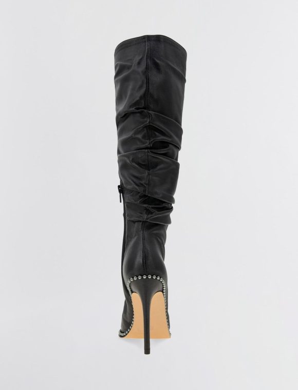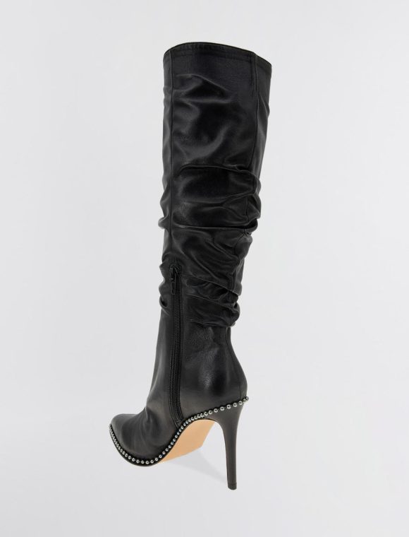 Black pointed toe tall boot crafted from leather. Detailed with a ball chain trim accent. Done with a slouchy shaft and an inner zipper closure. Finished with a sleek stiletto heel.