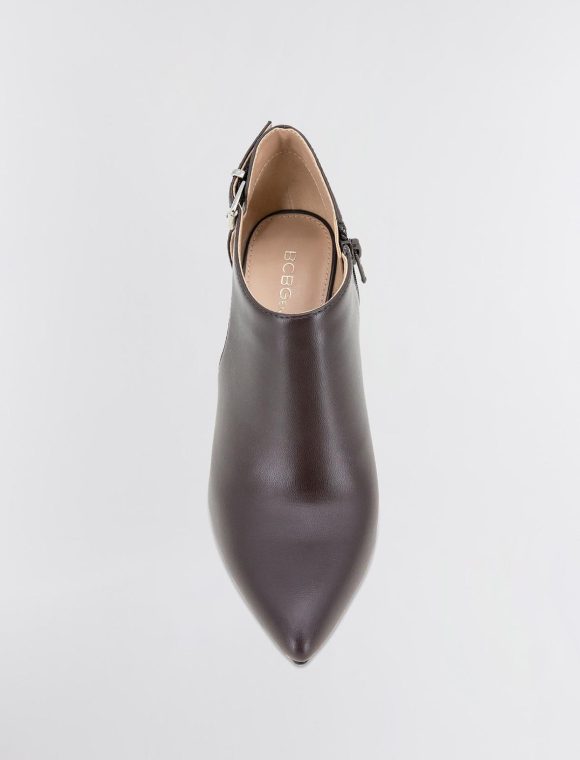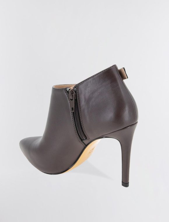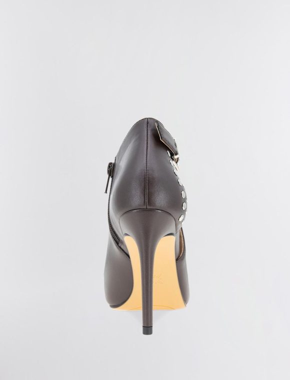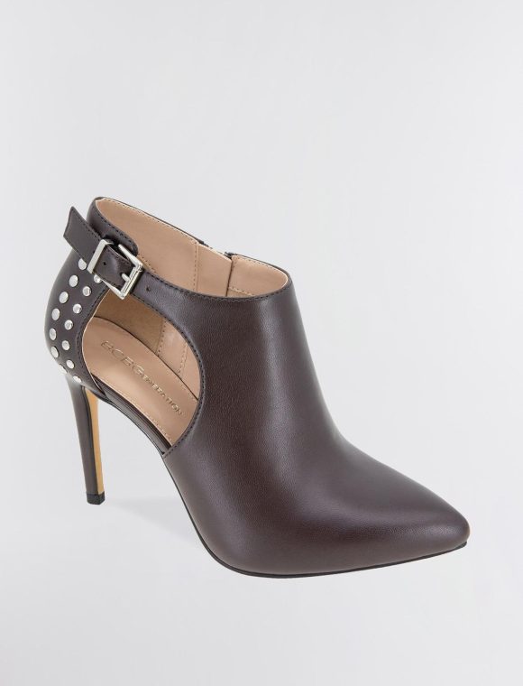 Edgy brown shootie made from faux leather and embellished with metal studs. Designed with a pointed toe and a sexy cutout. Topped with an adjustable buckle and inner zipper closure.
