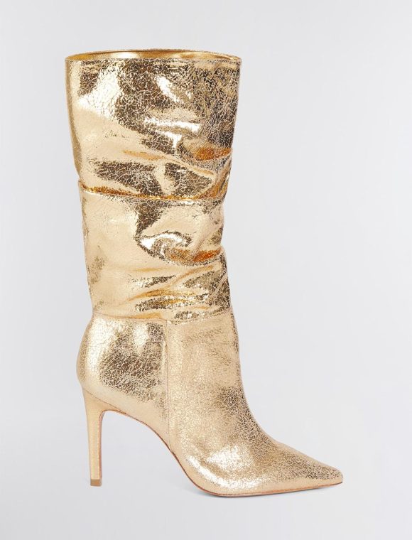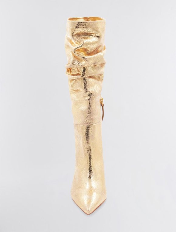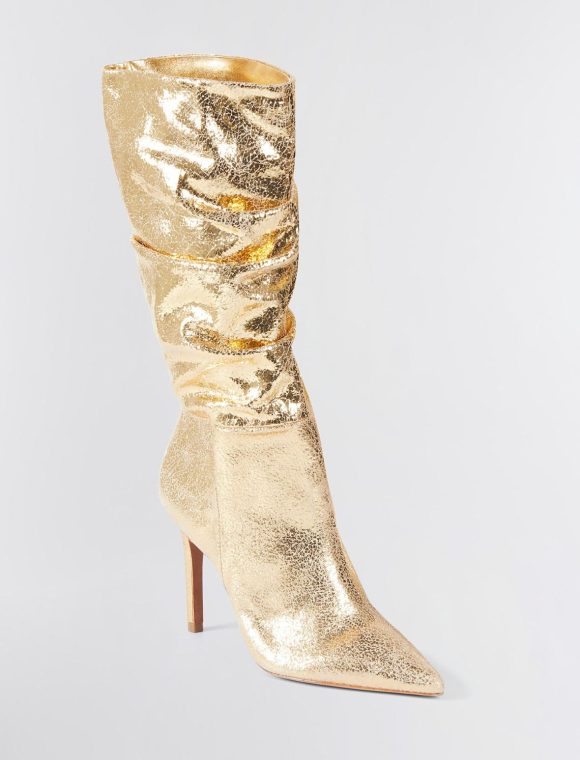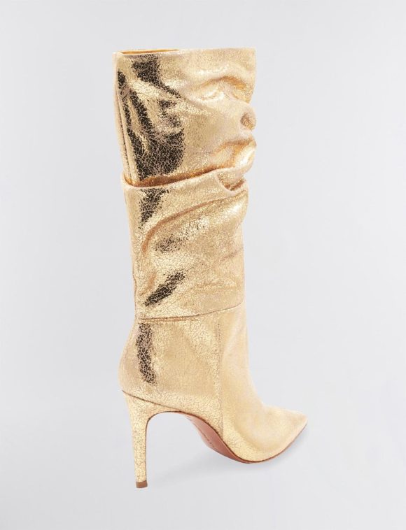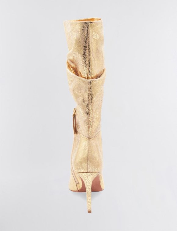 Shiny metallic leather decorates a chic, tall boot. Crafted in a relaxed, slouchy silhouette. Finished with a pointed toe and a sleek stiletto heel.