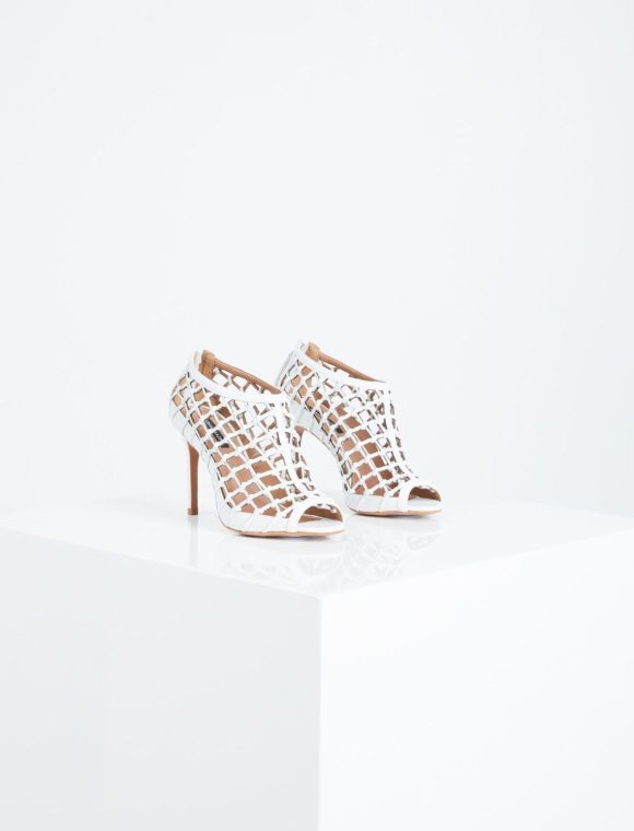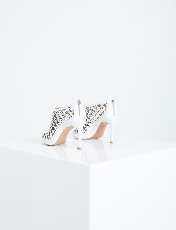Edgy bootie crafted from leather in a caged design. Made with a peep toe and a back zip closure. Complete with a thin stiletto heel. Leather upper, lining and sole Spot clean Made in Brazil 4″ heel