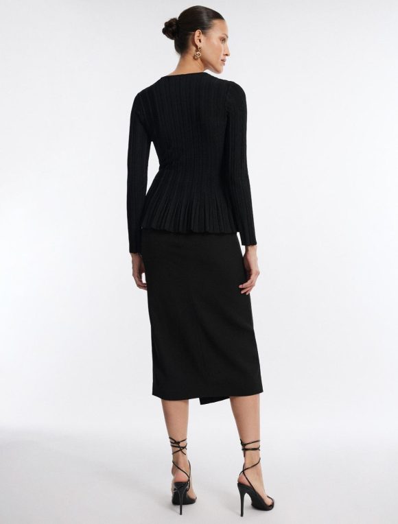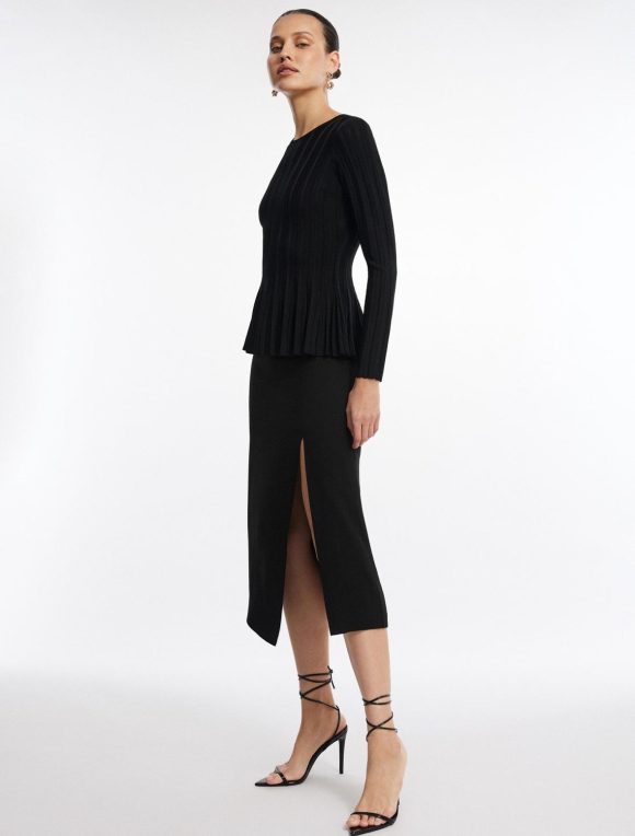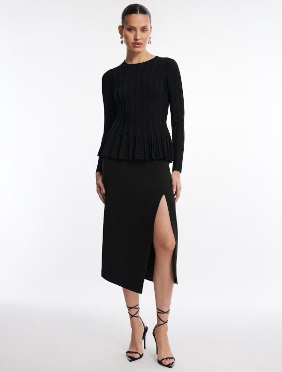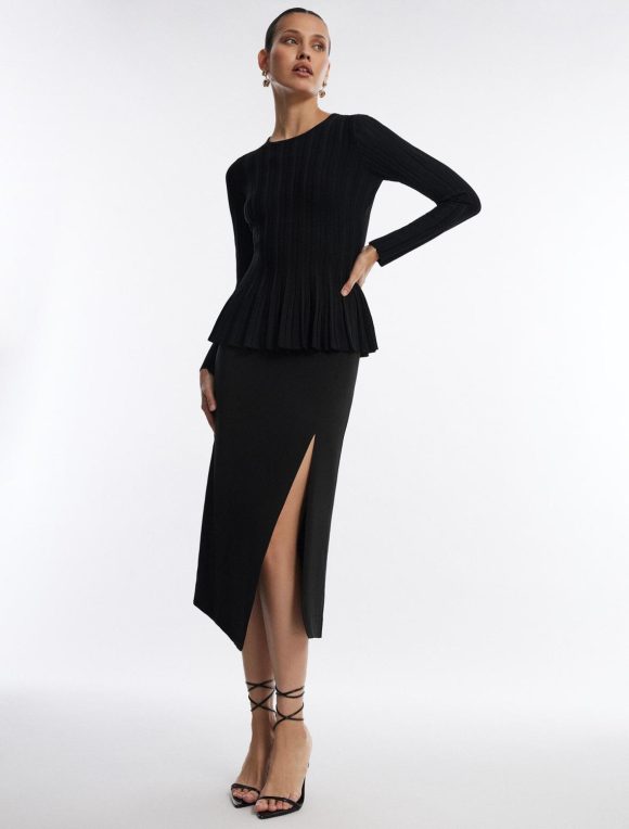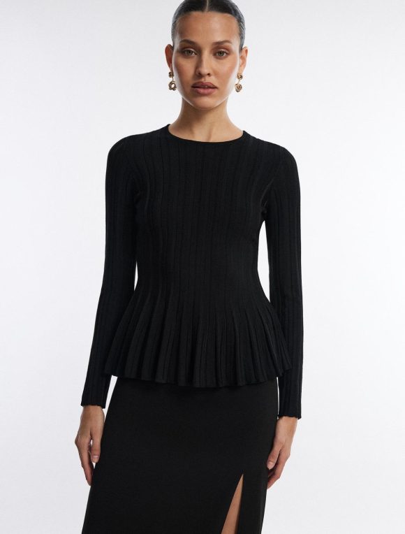 Eye-catching black top with a feminine silhouette. Done from a stretch rib knit in a pullover design with a crew neckline and long sleeves. Crafted with a flattering flared peplum waist.