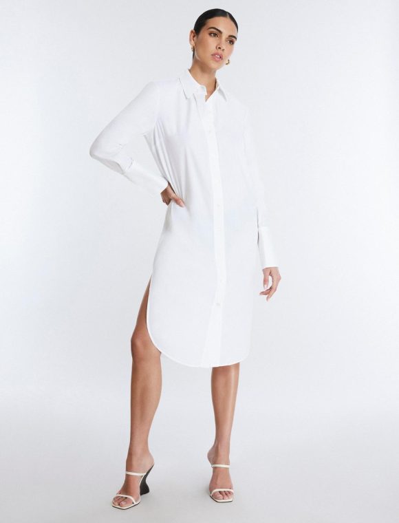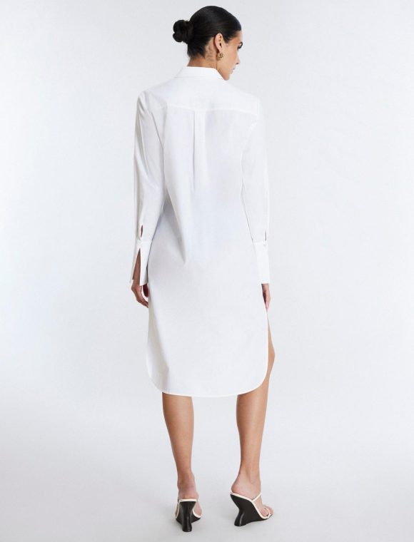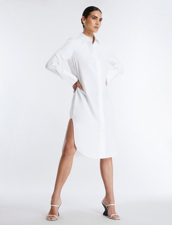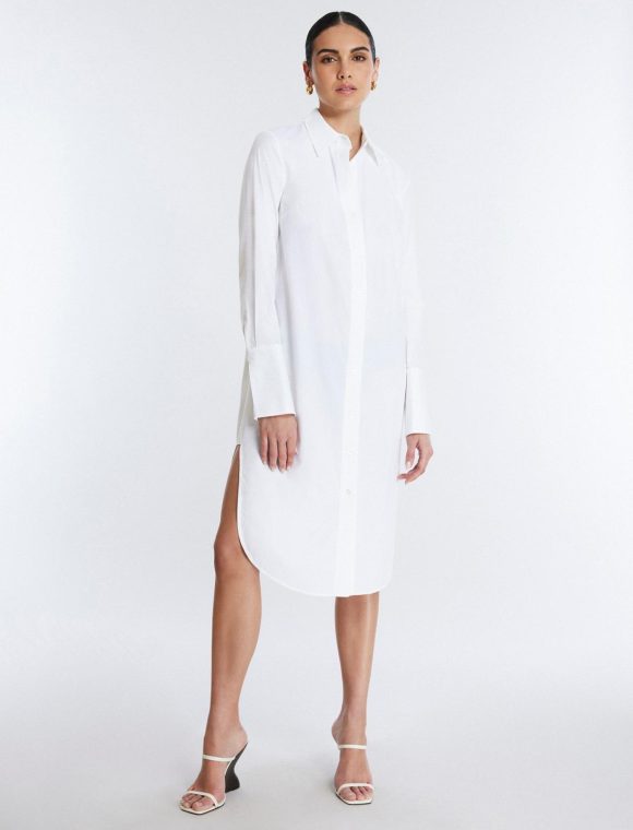Essential white shirt dress in a lightweight cotton poplin. Topped with a collar neckline and long sleeves. Crafted in a midi length shift silhouette that hits below the knee. Finished with front buttons and side slits.