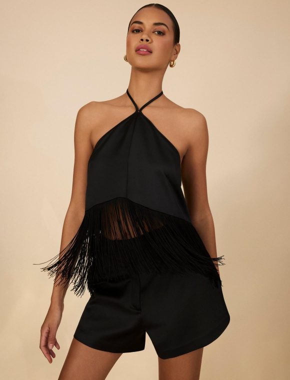 Bold black crop top with a halter tie neckline and dramatic fringe trim. Crafted in stretch satin with a high low hem that hits just below the waist.