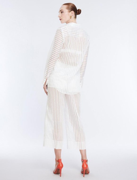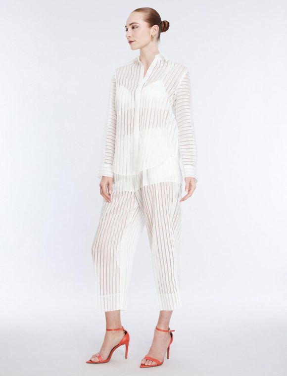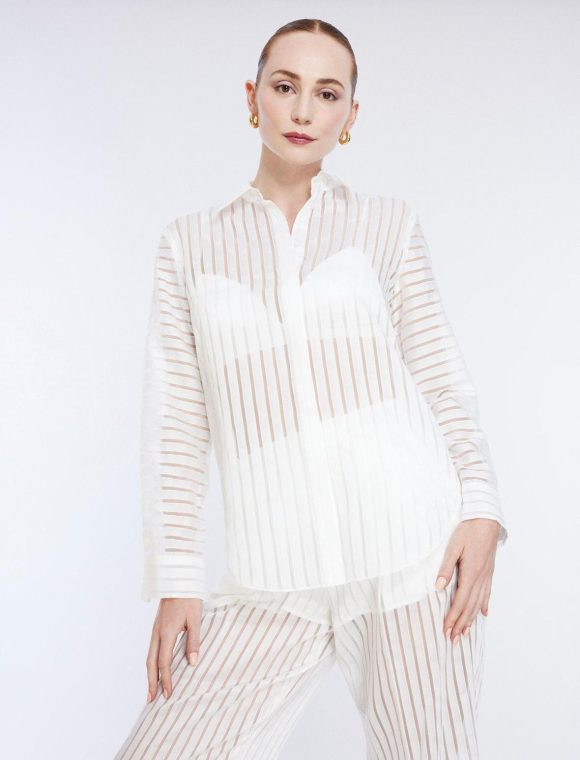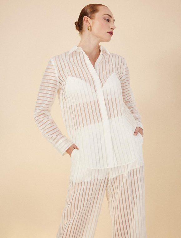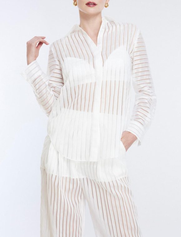 Go-to top in shade gardenia with a collared neckline and long sleeves with button cuffs. Crafted from sheer striped organza in a relaxed silhouette that hits below the waist. Done in a classic button-down style.