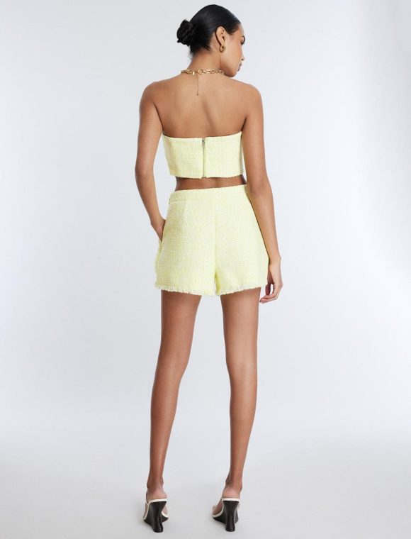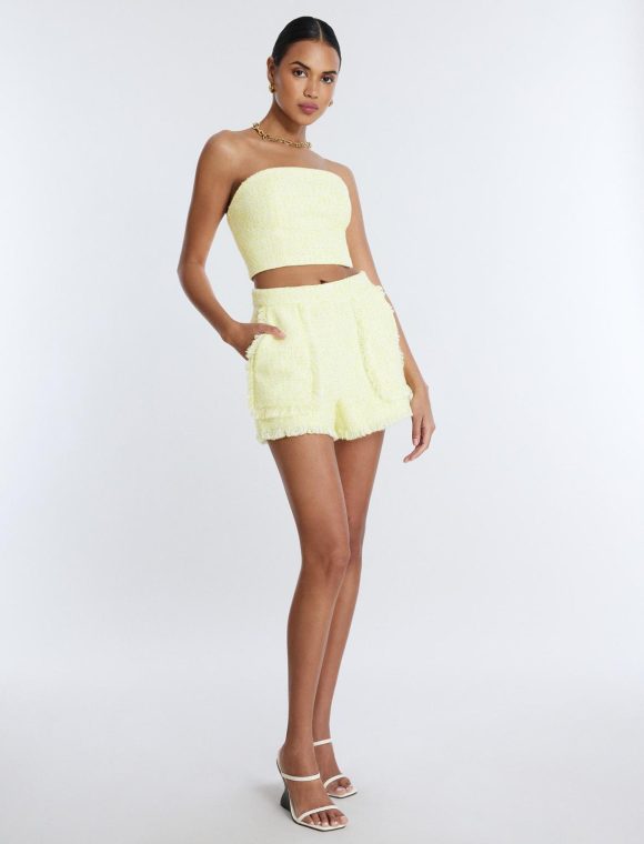 Strapless crop top in eye-catching yellow. Topped with a straight neckline and finished in a cropped length that hits above the waist. Crafted in a bodycon style and finished with a back zipper closure.